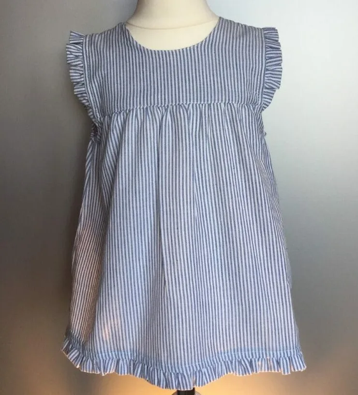 Fin børnekjole med smalle lyseblå og hvide striber. Lækker vævet bomuldskvalitet.