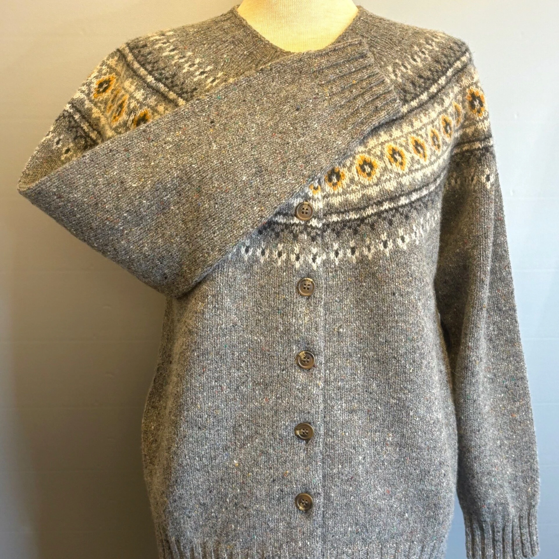 Farve: St. Kilda – Grå. En smuk og klassisk farvestilling, hvor hovedfarven er lysegrå med små matchende farvenister i garnet. Det fine mønster i naturhvidt og varmgul over skuldrene lyser op uden at larme eller forstyrre det ensfarvede udtryk.