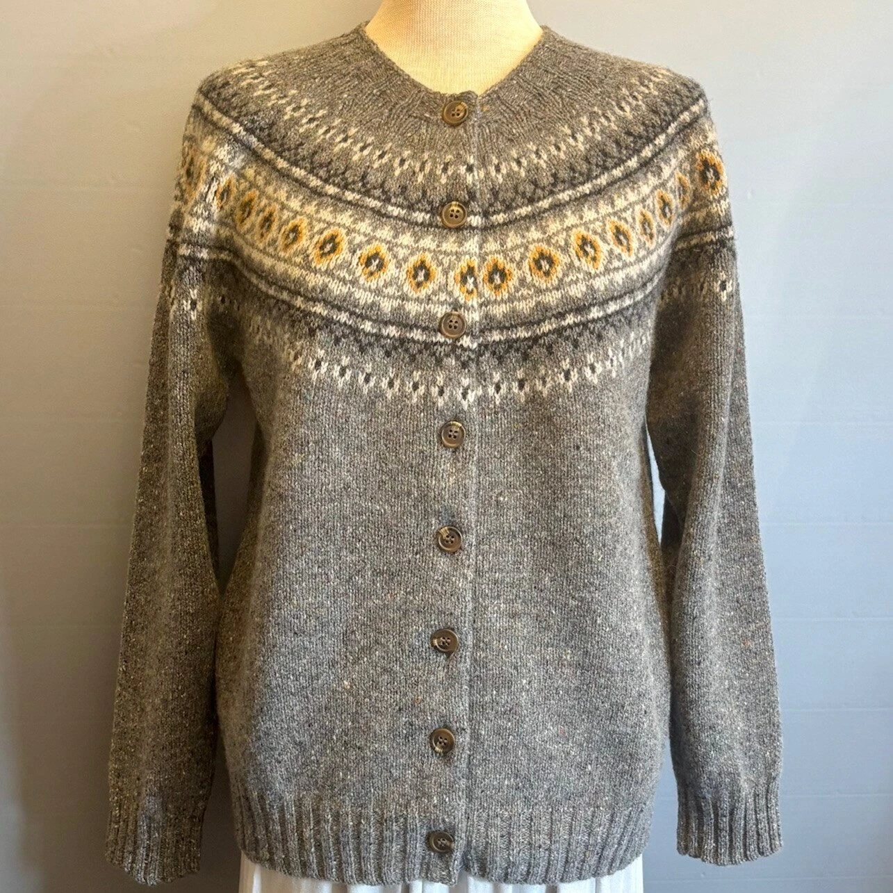 Skøn strikjakke i lækker uld fra skotske Harley of Scotland. Modellen er af moderat længde og vidde – den følger kroppen, sidder til over skulderene, men er alligevel bekvem of rummelig i kroppen. Mønsteret, der går hele vejen rundt om skuldrene, er en moderne fortolkning af den klassiske færøske stik. Klassisk og moderne.